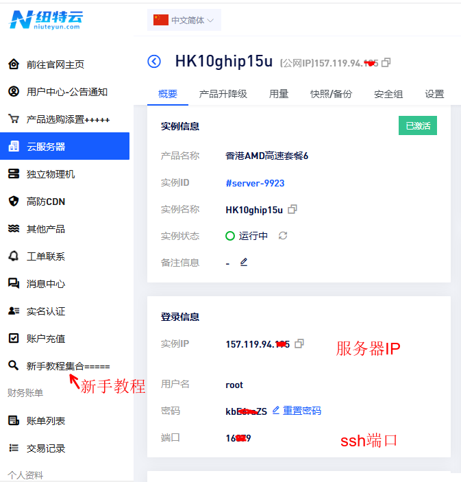 1.获取已购买云服务器详细信息:登录官网https://www.niuteyun.com/控制后台,找到已开通服务器,点击套餐名字进去控制页面,服务器详情的左侧有云服务器的IP,账户,密码,ssh端口号。可以拷贝出来放txt备用